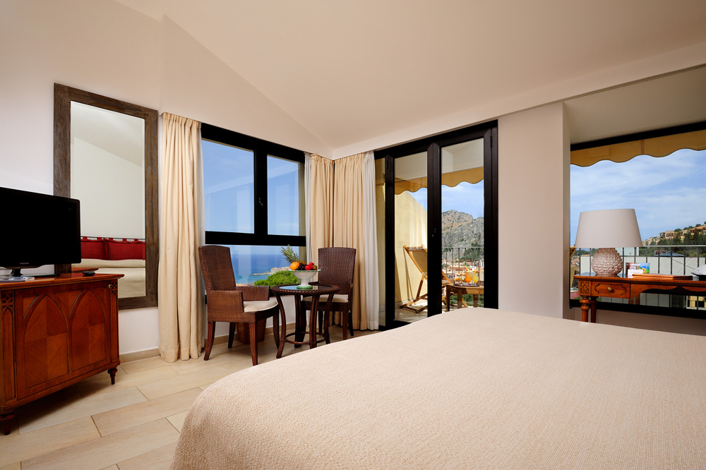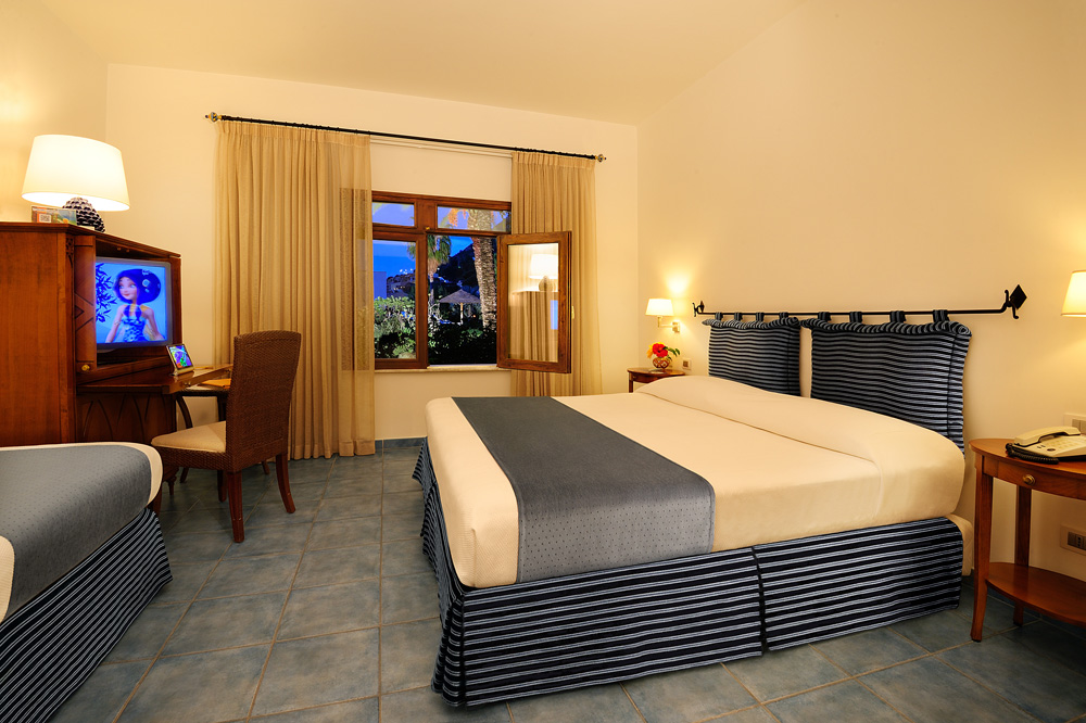 DELUXE: 22-25 m² side sea view room with balcony, classic cherry wood furnishings, king-size bed, 32” – 55” TV, bathtub or shower.lephon, free wifi, writing desk, tea and cofree maker, woven leather armchairs, fine egyptian cotton sheets, hair dryer and makeup mirror, safe with electronic combination, goose down or hypoallergenic pillows, minibar with soda, snacks and alcoholic drinks.