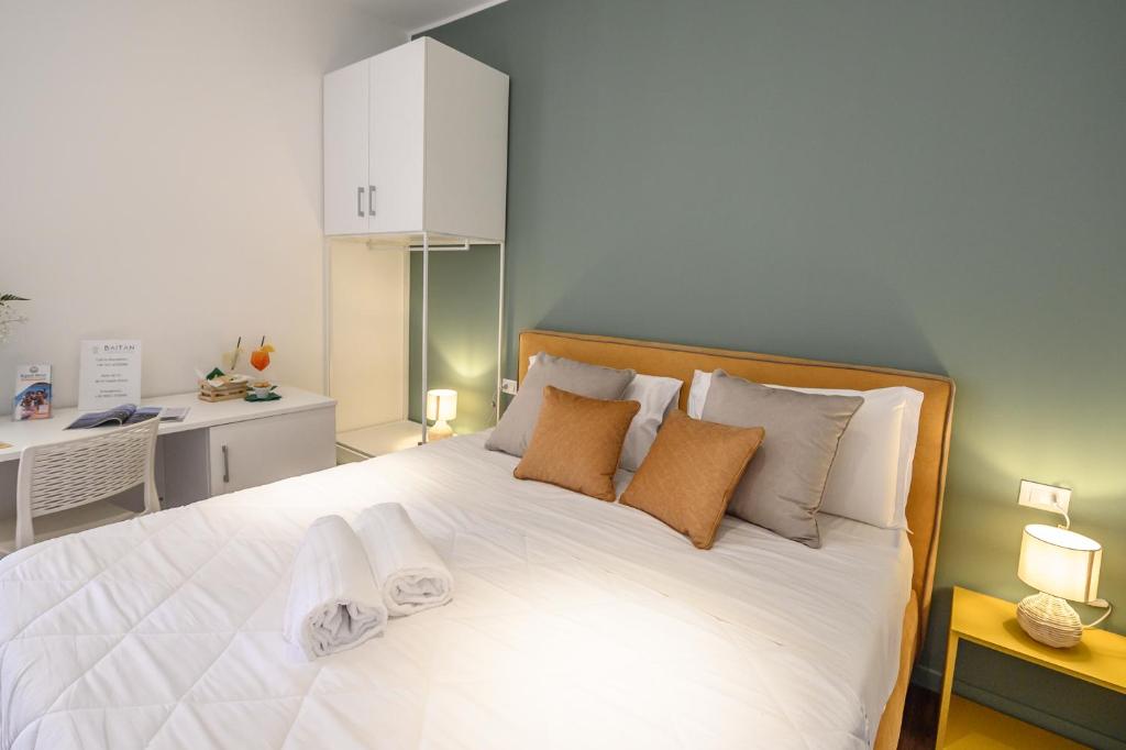DELUXE DOUBLE: The Deluxe Double room at Baitan Hotel features an area of approximately 22sqm, suitable for two adults and a child, or for single use. The rooms have a full-size double bed and have been thoughtfully designed with every comfort. The "full-size" bed is smaller than those in other double rooms at the hotel, measuring 140 cm x 190 cm.