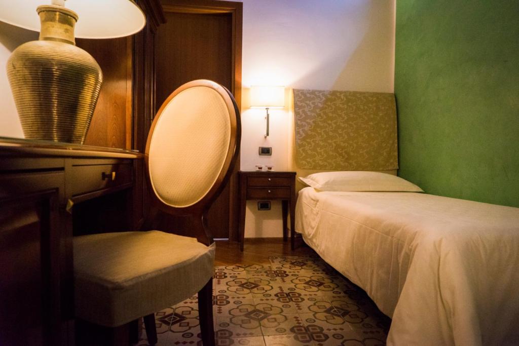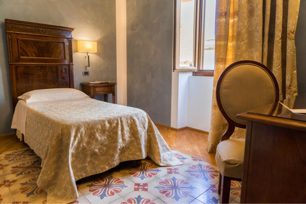 Bright and welcoming, furnished in authentic Sicilian style. Private bathroom. The rooms overlook the quiet inner courtyard of the building, the peaceful Piazza del Carmine or the hotel garden.