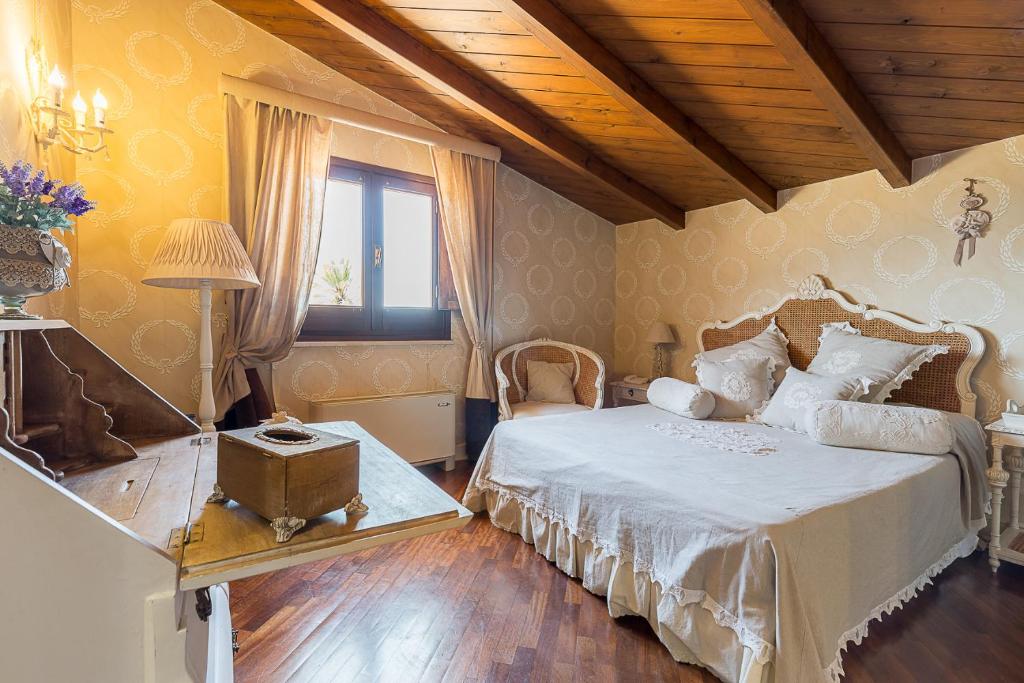 DELUXE: Spacious and bright but intimate rooms, enriched by laces and furnishing details. Ideal place for the couple looking for intimacy and relaxation characterized by slower rhythms: in addition to a large window, a terrace overlooking the Sicilian countryside allows you to enjoy breakfast in your room, but also to enjoy aperitifs, or a glass of wine , perhaps admiring the starry sky of the hot summer nights. The Deluxe room is one of the two rooms on the upper floor of the main building of the mansion, with a double room on different levels: accessed via a staircase that makes it even more intimate.