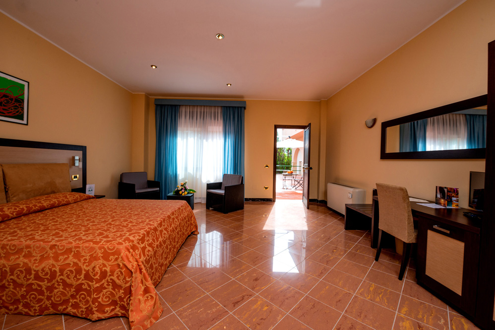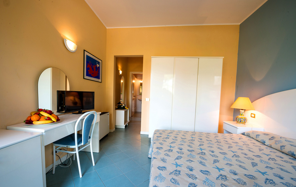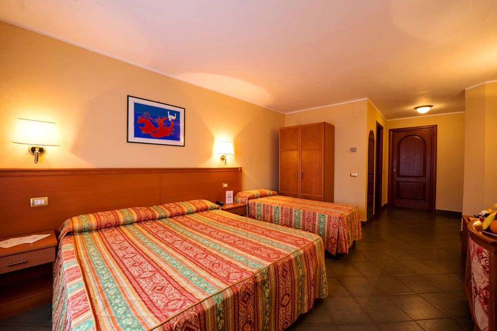 The hotel is surrounded by nature and is made up of 17 buildings of 1 or 2 floors for a total of 175 rooms and 6 suites, some with balconies or terraces and/or facing the sea. The classic quadruple rooms with bunk beds can accomodate two adults and two children aged between 2 and 13 years old. They all have air conditioning, telephone with direct external line, tv with satellite programs, mini bar (filling on request for a fee) and private bathroom with shower cabin and airdryer . The 6 elegant suites have a living room, bedroom and private bathroom with walk-in shower, bathtub and hairdryer.