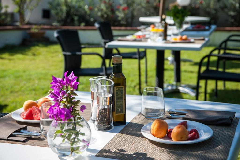 El hotel cuenta con 50 habitaciones espaciosas y cómodas, algunas con balcón o terraza, otras con vistas al mar o al jardín, y otras con bañeras de hidromasaje. Algunas habitaciones están ubicadas en un complejo más privado, a unos 30 metros del edificio principal, con habitaciones con patio con vistas al jardín.