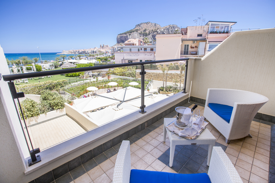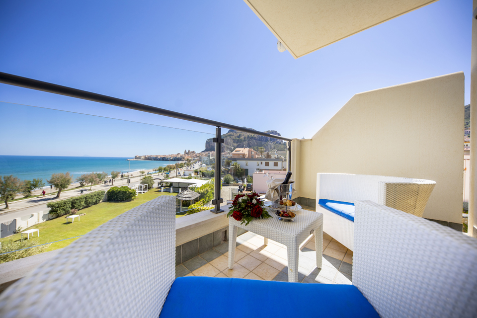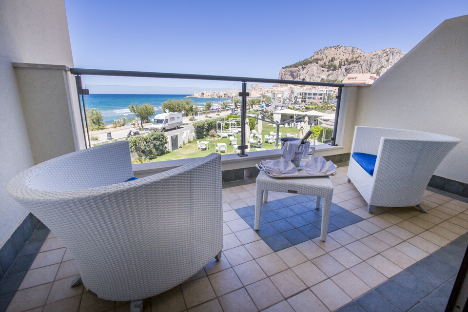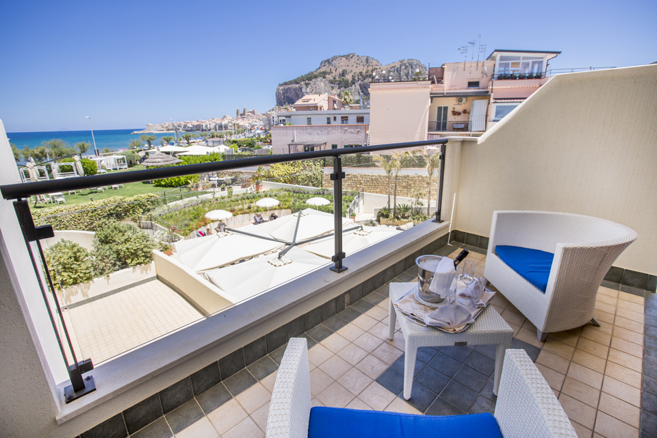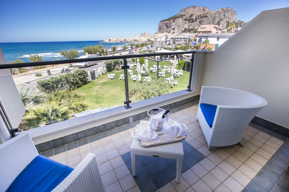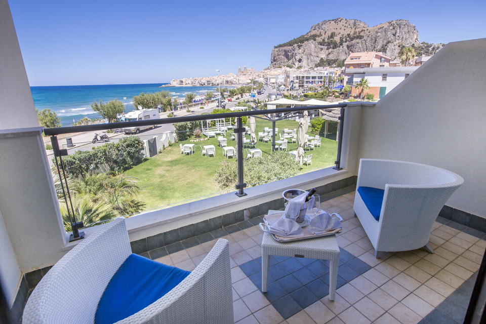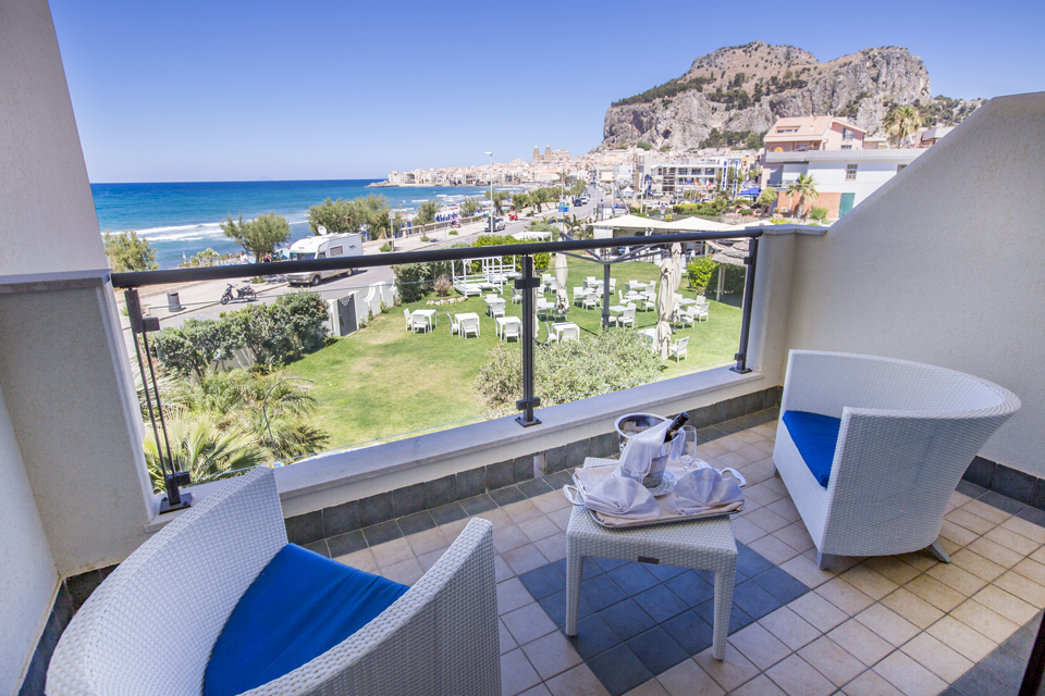 El vestíbulo, grande y acogedor con sus amplias ventanas, ofrece una vista increíble de 360 grados de la bahía. Dentro encontrarás dos candelabros de cristal colgando majestuosos y una escalera principal especialmente diseñada que aporta un sentido de magnificencia a toda la estructura. El hotel cuenta con un SPA con baños de hidromasaje, sauna, baño turco, salas de masaje, camas de agua, sillas de pedicura PODO Spa, tratamientos siberianos y un salón de peluquería. También hay una sala de conferencias para unas 280 personas, equipada con instalaciones de videoconferencia. La piscina (con hidromasaje) y la piscina para niños están ubicadas cerca del café, en el centro del solárium, que también alberga un pequeño anfiteatro para entretenimiento nocturno. Hay un amplio césped con juguetes para niños. La playa privada está justo al otro lado de la calle, a unos 15 metros del hotel, y está reservada exclusivamente para los huéspedes del hotel. Cuenta con un café, baños, duchas, sombrillas de playa y tumbonas disponibles. Allí puedes tomar una bebida en el café o disfrutar tanto de los platos tradicionales de Sicilia como de una cocina moderna en el restaurante. Desde el jardín en la azotea se pueden contemplar las amplias vistas del mar y la playa de Cefalù, una vista encantadora que te llenará de admiración por la ciudad conocida justamente como “la Perla del Mar Tirreno.”
