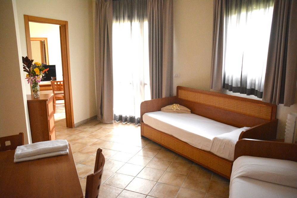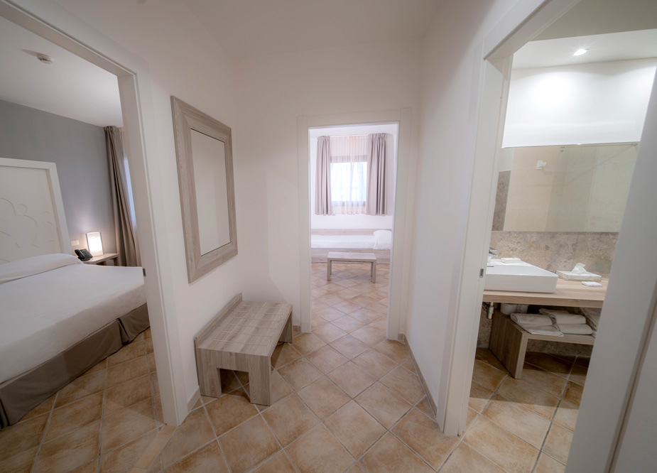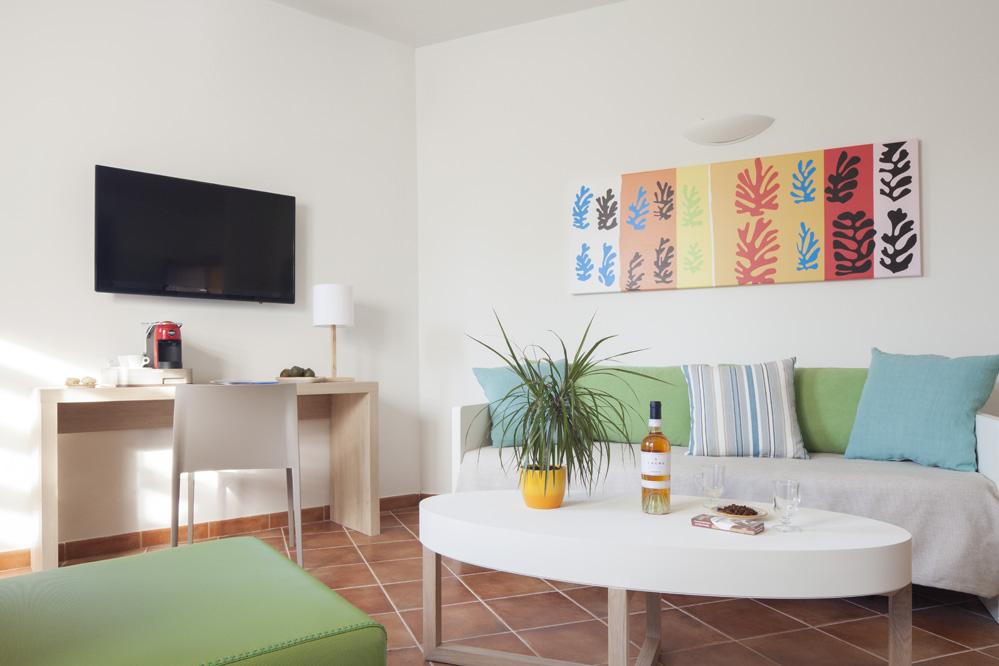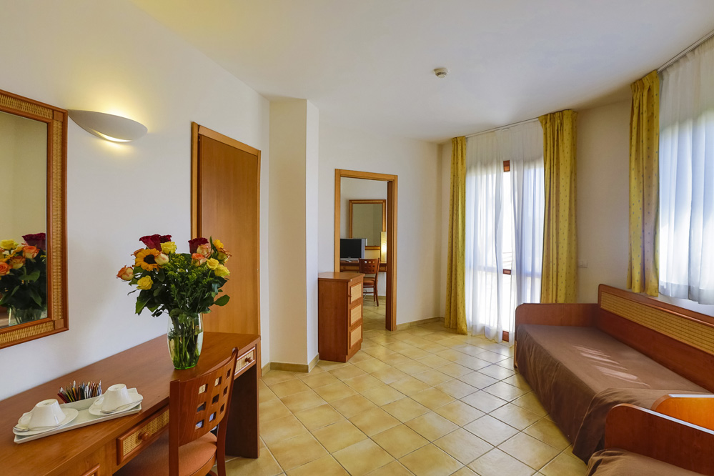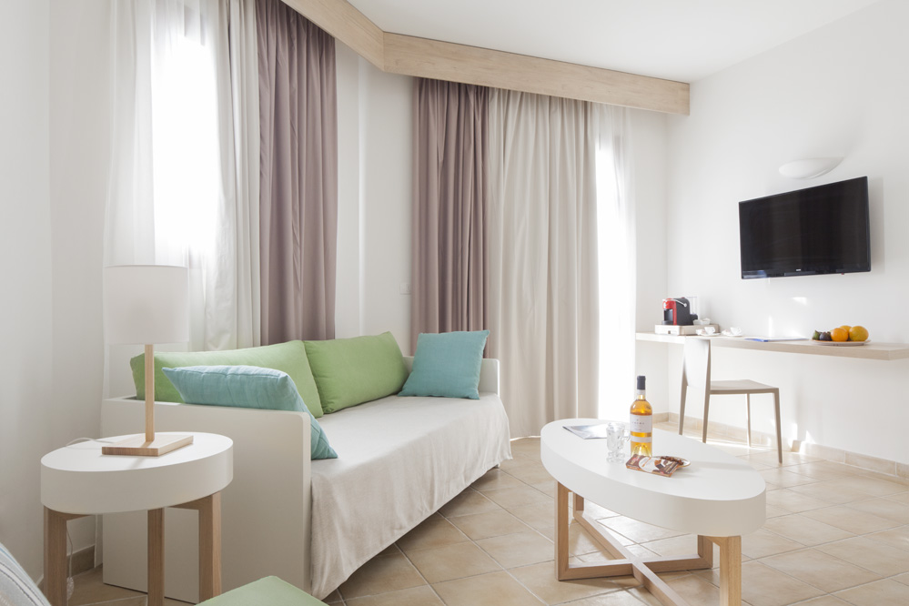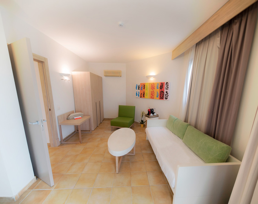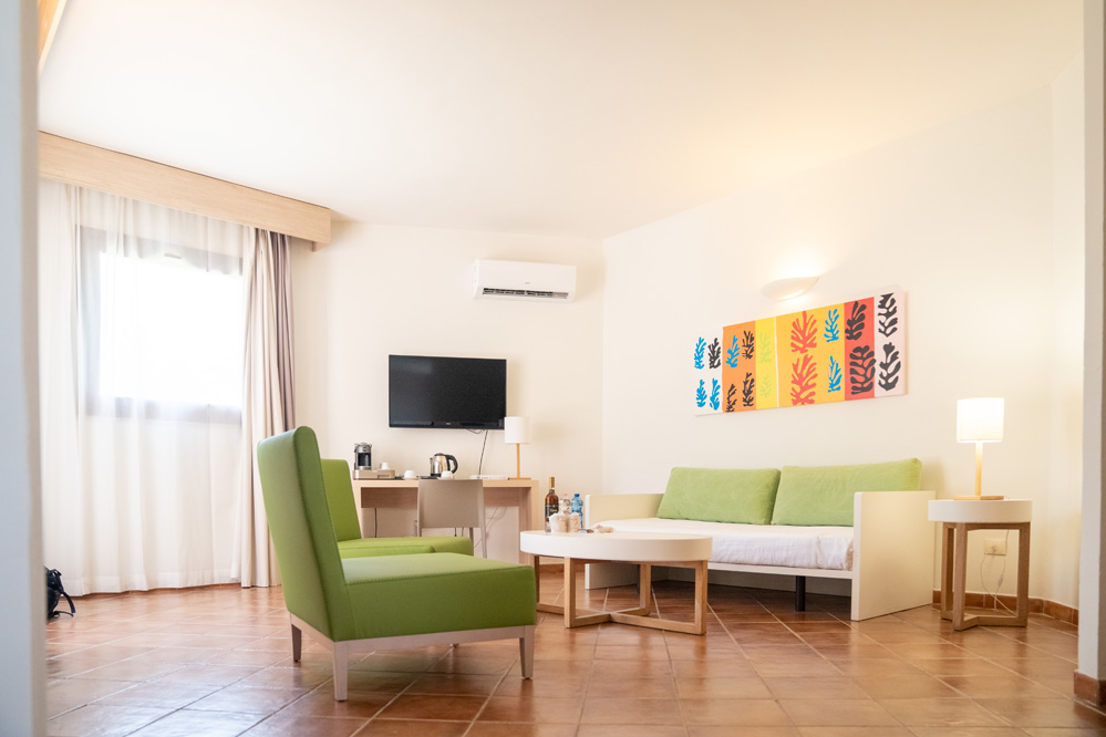 - SUITE JUNIOR SUPERIOR (40 m2): (mín. 2 - máx. 2 personas + 1 niño + cuna) Las habitaciones Suite Junior Superior disfrutan de una posición central, rodeadas de hermosos jardines. Están cerca de los servicios principales y son ideales para huéspedes que buscan más privacidad y comodidad. Cuentan con una amplia zona de estar, 1 baño y una zona de descanso con cama doble y dos televisores satelitales con pago por visión. Además de los servicios incluidos en las habitaciones Superior, ofrecen: Un paraguas y dos tumbonas por habitación reservados en la primera fila de la playa; Traslado gratuito de ida y vuelta a Siracusa (3 traslados/persona para estancias mínimas de 7 noches; 1 traslado/persona para estancias más cortas).