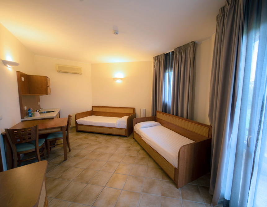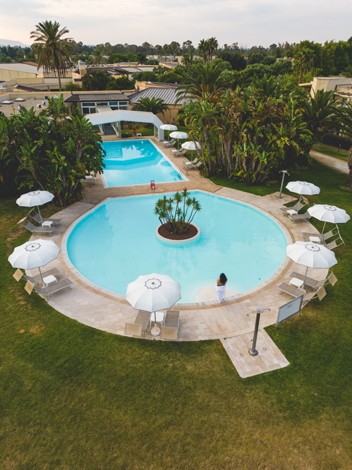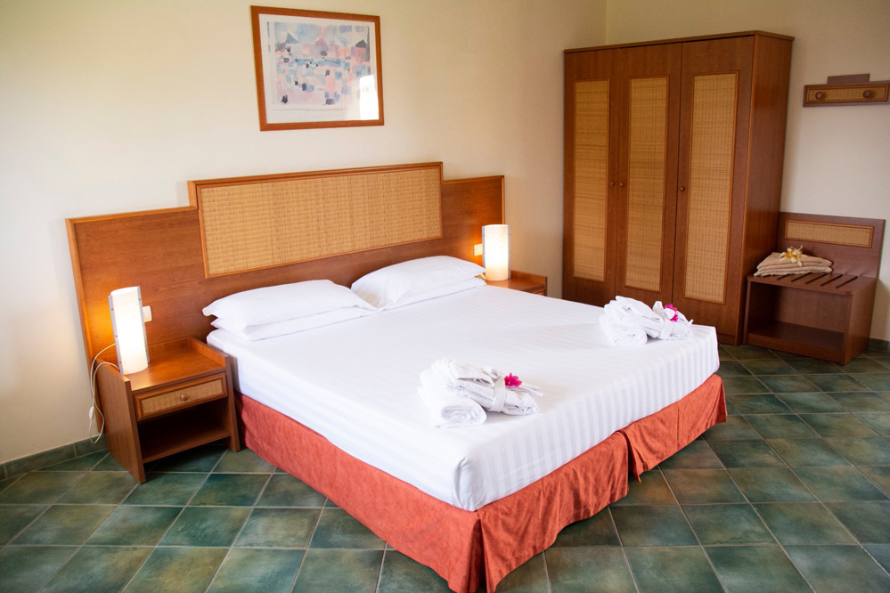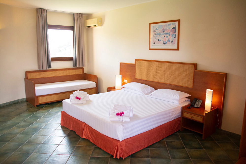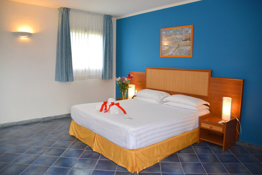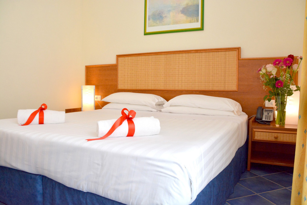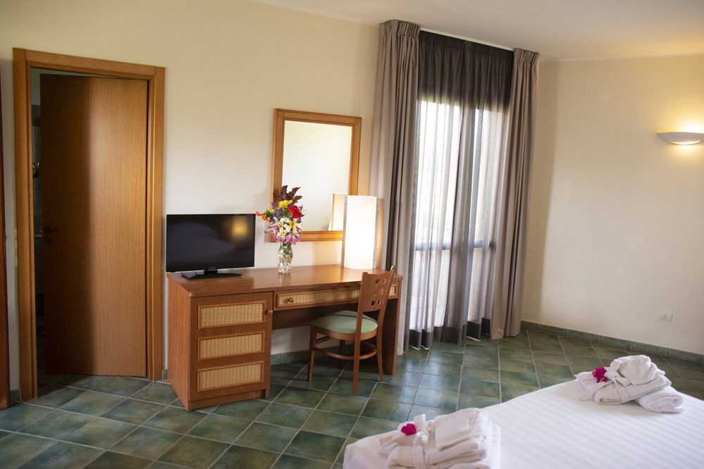 - SUITE JUNIOR SUPERIOR (40 m2): (mín. 2 - máx. 2 personas + 1 niño + cuna) Las habitaciones Suite Junior Superior disfrutan de una posición central, rodeadas de hermosos jardines. Están cerca de los servicios principales y son ideales para huéspedes que buscan más privacidad y comodidad. Cuentan con una amplia zona de estar, 1 baño y una zona de descanso con cama doble y dos televisores satelitales con pago por visión. Además de los servicios incluidos en las habitaciones Superior, ofrecen: Un paraguas y dos tumbonas por habitación reservados en la primera fila de la playa; Traslado gratuito de ida y vuelta a Siracusa (3 traslados/persona para estancias mínimas de 7 noches; 1 traslado/persona para estancias más cortas).