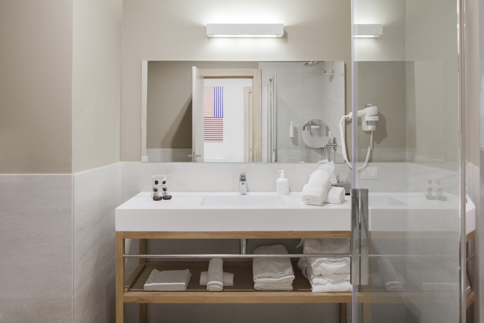 - HABITACIÓN PREMIUM: 23-28 m2 Doble Premium (mín. 1 – máx. 2 personas + cuna), Triple Premium (mín. 3 – máx. 3 personas + cuna) Las Habitaciones Premium, completamente renovadas y ubicadas en el edificio central, están más cerca de las instalaciones. También incluyen los siguientes extras: Cambio diario de toallas de playa (a petición), Set de cortesía, Mesa reservada en el Restaurante Aretusa (hasta el 1 de junio y desde el 28 de septiembre, mesa reservada en una zona dedicada del restaurante principal), Mini nevera (bebidas incluidas, sin reposición), Entrada exclusiva diaria a la piscina Wellness (para huéspedes hasta 12 años).