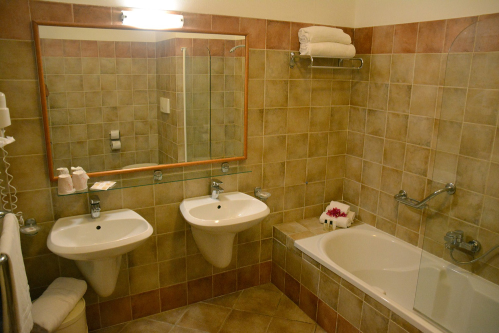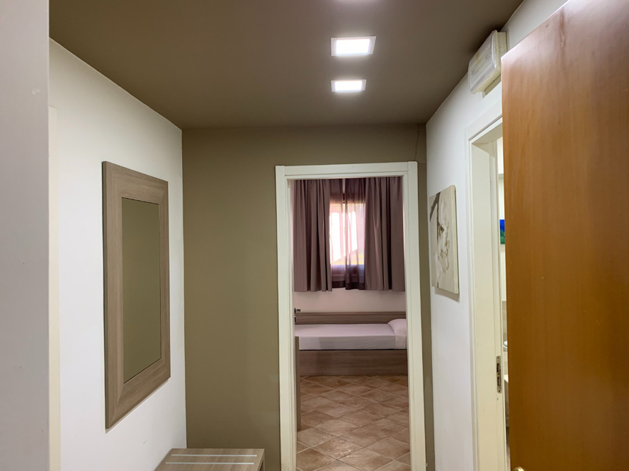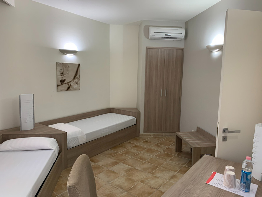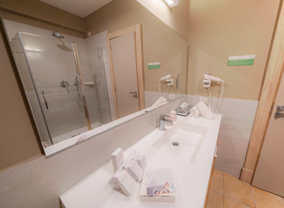 - HABITACIÓN DOBLE CONFORT: 23 m2 (mín. 1 – máx. 2 personas + cuna); Las Habitaciones Confort están completamente renovadas con mobiliario de colores suaves y en el baño. Las Habitaciones Cuádruples Confort consisten en una sala de estar con dos camas individuales, un dormitorio con cama doble y un baño.