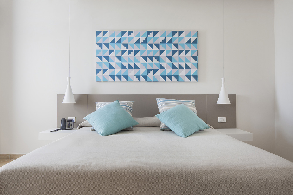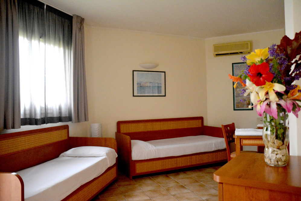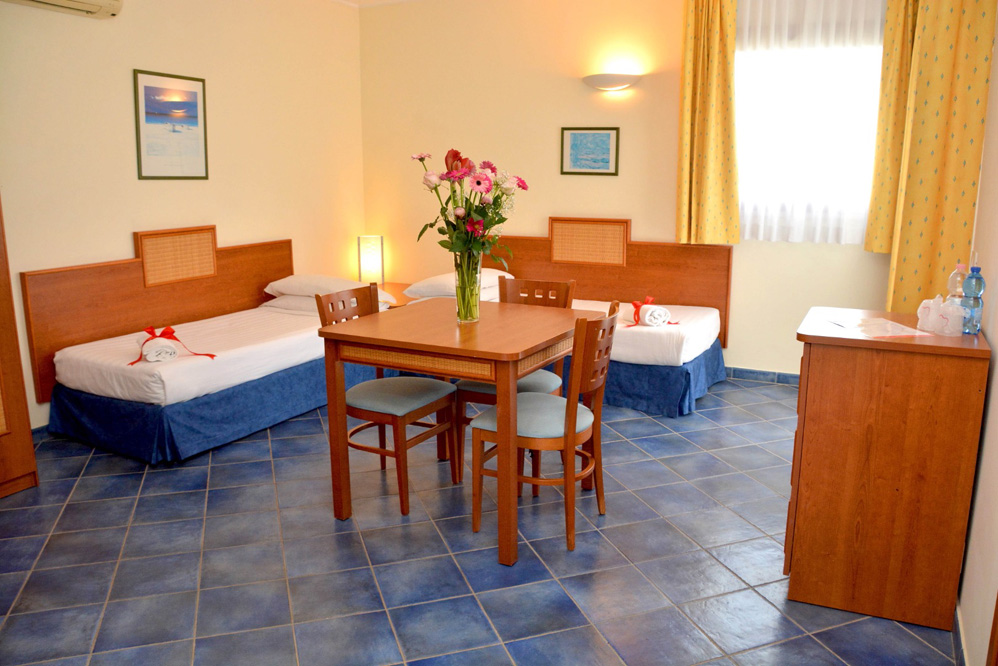 - HABITACIÓN CLÁSICA: 23-34m2 - Doble Clásica (máx. 2 personas + cuna), Triple Clásica (mín. 3 – máx. 3 personas + cuna) Cuádruple Clásica (máx. 4 personas + cuna, algunas con posibilidad de 5ª cama para adulto) Las Habitaciones Clásicas son muy espaciosas y están decoradas en amarillo, azul y blanco, creando un ambiente acogedor, informal y relajante. Las Habitaciones Cuádruples Clásicas están compuestas por una sala de estar con dos camas individuales, un dormitorio con cama doble y un baño.