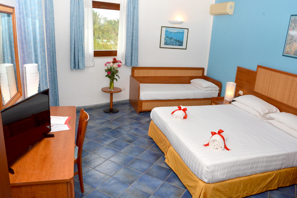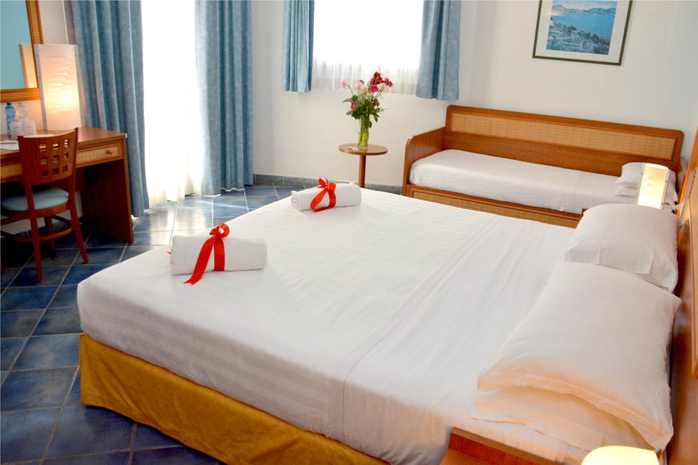 - HABITACIÓN SUPERIOR*: 28-34 m2 Doble Superior (mín. 2 – máx. 2 personas + cuna) Triple Superior (mín. 3 – máx. 3 personas + cuna) Cuádruple Superior (mín. 4 – máx. 4 personas, cuna hasta la ocupación máxima) Completamente renovadas, constan de dos habitaciones separadas (sala de estar con TV satelital y dormitorio con otra TV satelital) y un baño.
