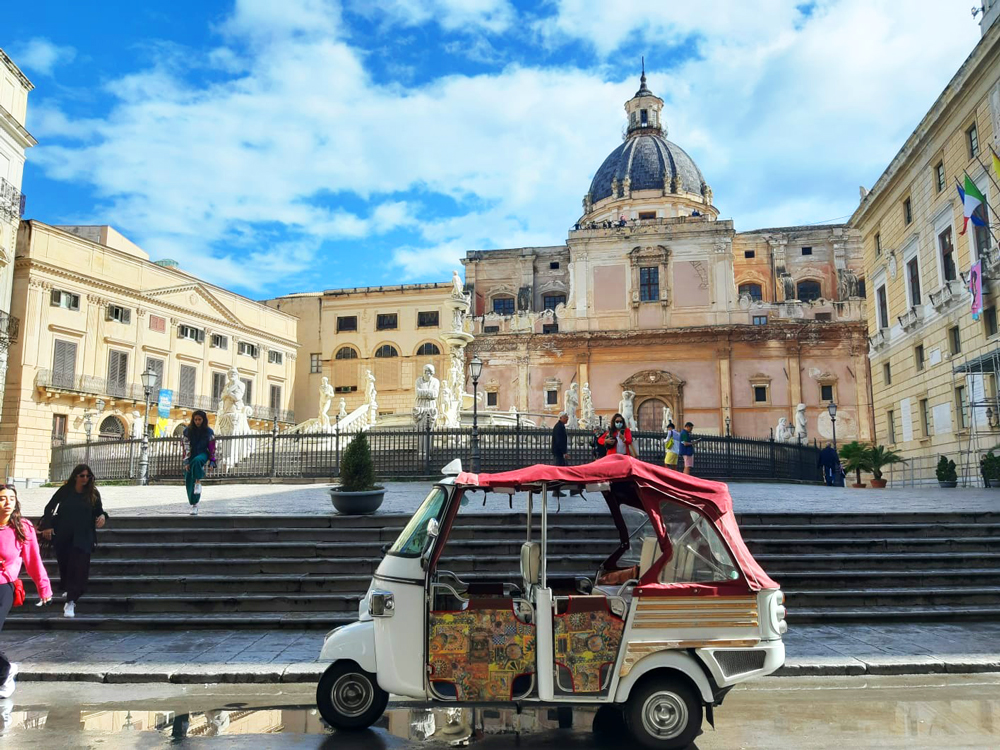 Inizia la tua avventura con un affascinante tour a bordo di un’ Ape calessino, che ti condurrà tra i mercati storici più celebri della città, come il Ballarò, il Vucciria e la Capo. Qui, tra bancarelle piene di colori e profumi, potrai vivere l’atmosfera vivace e autentica della Palermo di un tempo. Scoprirai aneddoti e curiosità sulla tradizione gastronomica siciliana, mentre assapori alcuni dei piatti tipici come panelle, arancine e sfincione. Il tour in ape ti farà scoprire il centro storico della più bella ed autentica Palermo