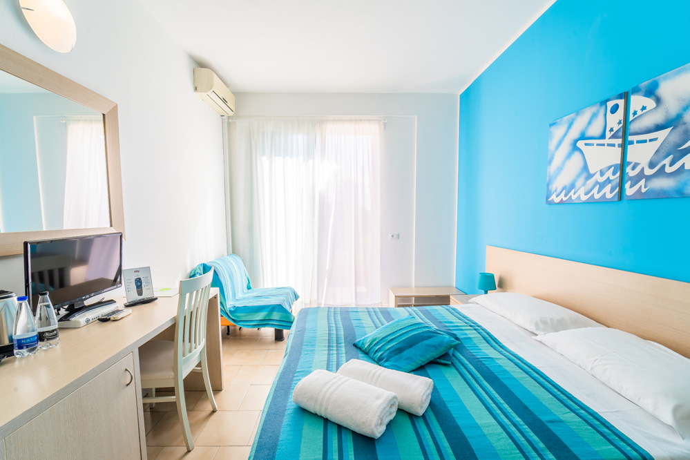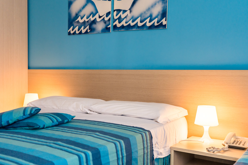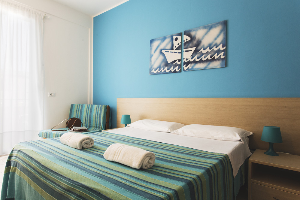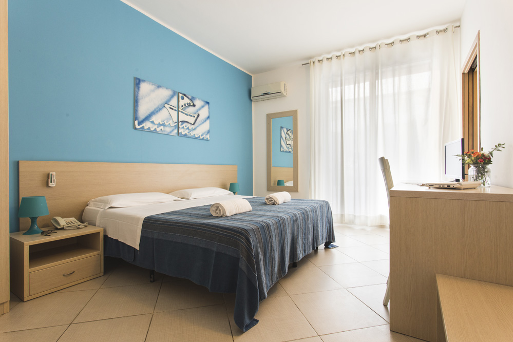 CAMERA DOPPIA: Vivace ed ospitatale la camera matrimoniale è la sistemazione perfetta per le coppie che vogliono viversi la vacanza a pieno. Dotata di letto matrimoniale, bagno privato con box doccia provvisto di phon e set di cortesia, telefono, TV, aria condizionata e se richiesto servizio sveglia.