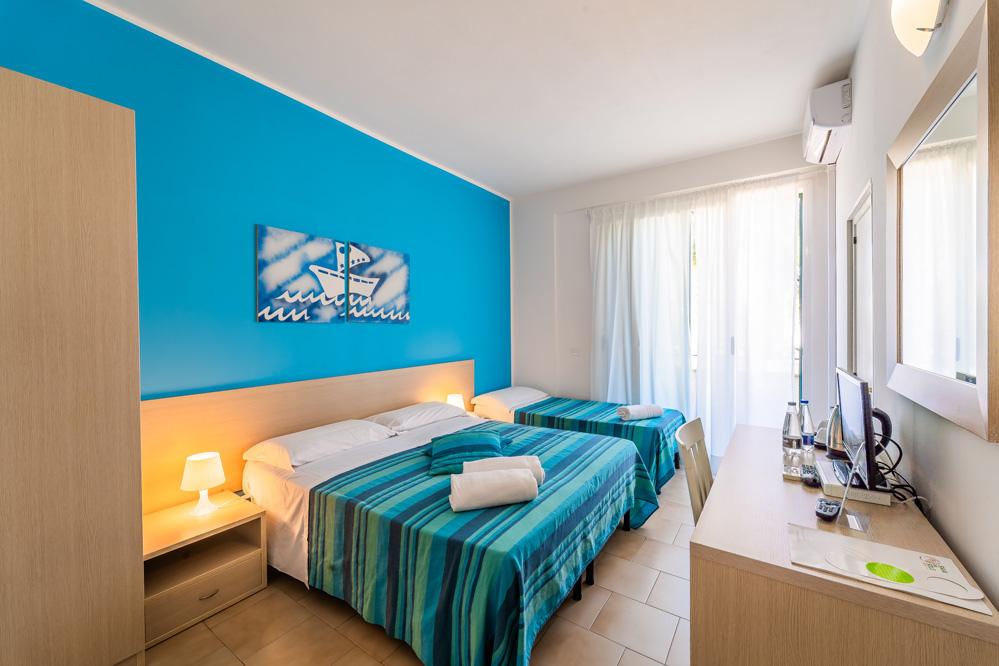 CAMERA TRIPLA: A seconda delle esigenze la tripla può essere composta o da un letto matrimoniale più un letto singolo o da un matrimoniale più una poltrona/letto o da tre letti singoli separati. Dotata di bagno privato con box doccia provvisto di phon e set di cortesia, telefono, TV, aria condizionata e se richiesto servizio sveglia.