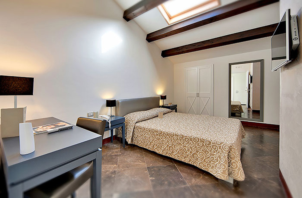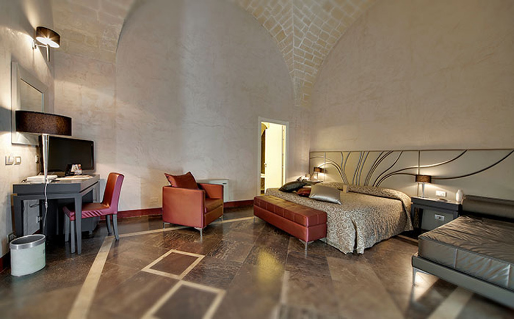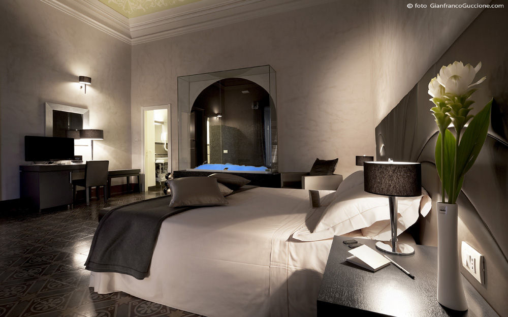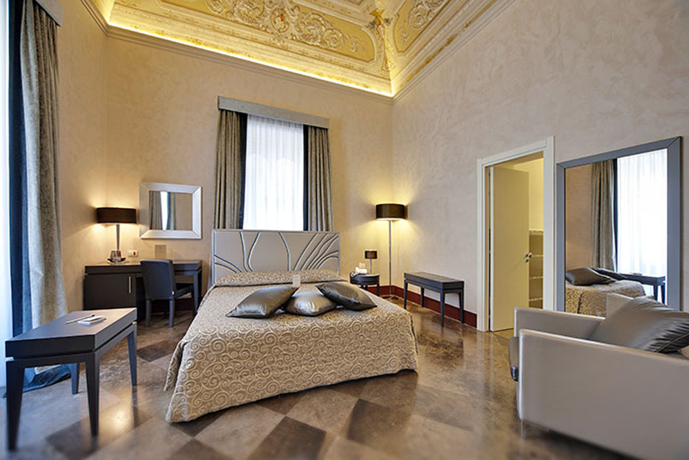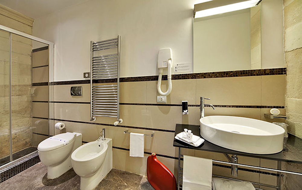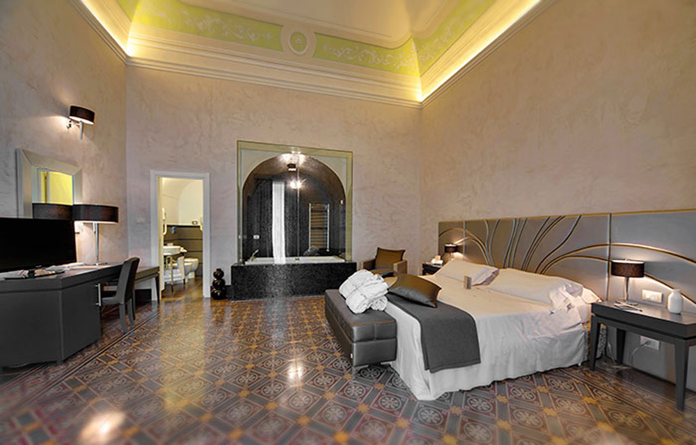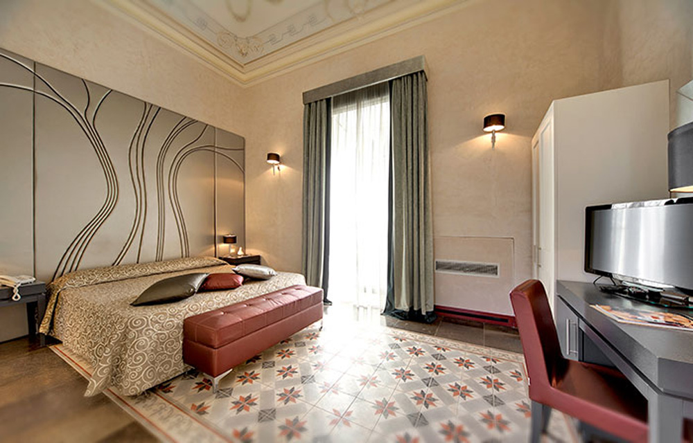 SUPERIOR: Scegliere di soggiornare in una delle camere della tipologia superior del De Stefano Palace, vuol dire vivere momenti di impareggiabile comfort e relax in un ambiente intimo e raccolto, circondati dal silenzio che contraddistingue le nostre dimore. Ricavate dal restauro conservativo di un palazzo nobiliare ottocentesco, le camere superior del De Stefano Palace, hotel a 4 stelle vicino a Ibla, sono pratiche e funzionali e allo stesso tempo eleganti e comode. A caratterizzare alcune delle camere sono le tipiche volte in pietra, dettagli dal fascino senza tempo rimasti intatti e autentici. Elementi di charme antico che anche nelle superior si uniscono in un connubio perfetto ai mobili dal design moderno scelti per arredare ogni camera di cui dispone il boutique hotel. Luminose, grazie a balconi, porte finestra o velux al soffitto, le superior sono la sistemazione ideale per una coppia di innamorati alla ricerca di un ambiente romantico in cui godere ogni istante della propria vacanza. Su richiesta in alcune è possibile anche aggiungere un terzo letto o richiedere letti separati. Il comfort e l’eleganza delle camere superior del De Stefano Palace sono ben distribuite all’interno di una superficie che va dai 18 e i 25 mq. Le diverse stanze della tipologia superior sono situate tra il piano terra e i piani superiori e queste ultime sono tutte caratterizzate da un balcone dal quale respirare l’aria del centro storico di Ragusa. Ognuna di esse è dotata di servizi privati con ampia doccia e in alcuni bagni è possibile apprezzare caratteristiche pareti originali del palazzo nobiliare ottocentesco. Il benessere degli ospiti è infine assicurato anche dal kit di cortesia Ortigia, in dotazione in ogni camera.