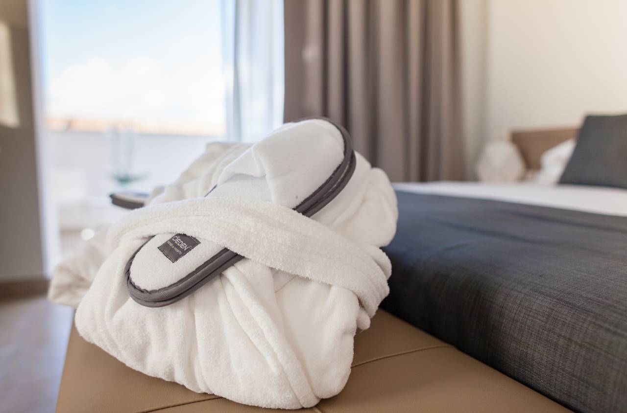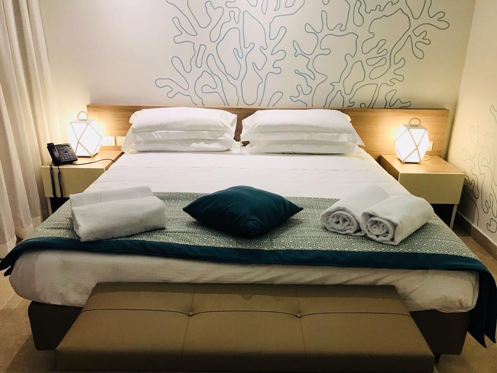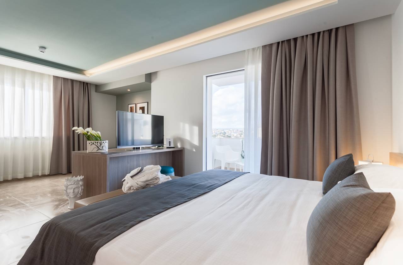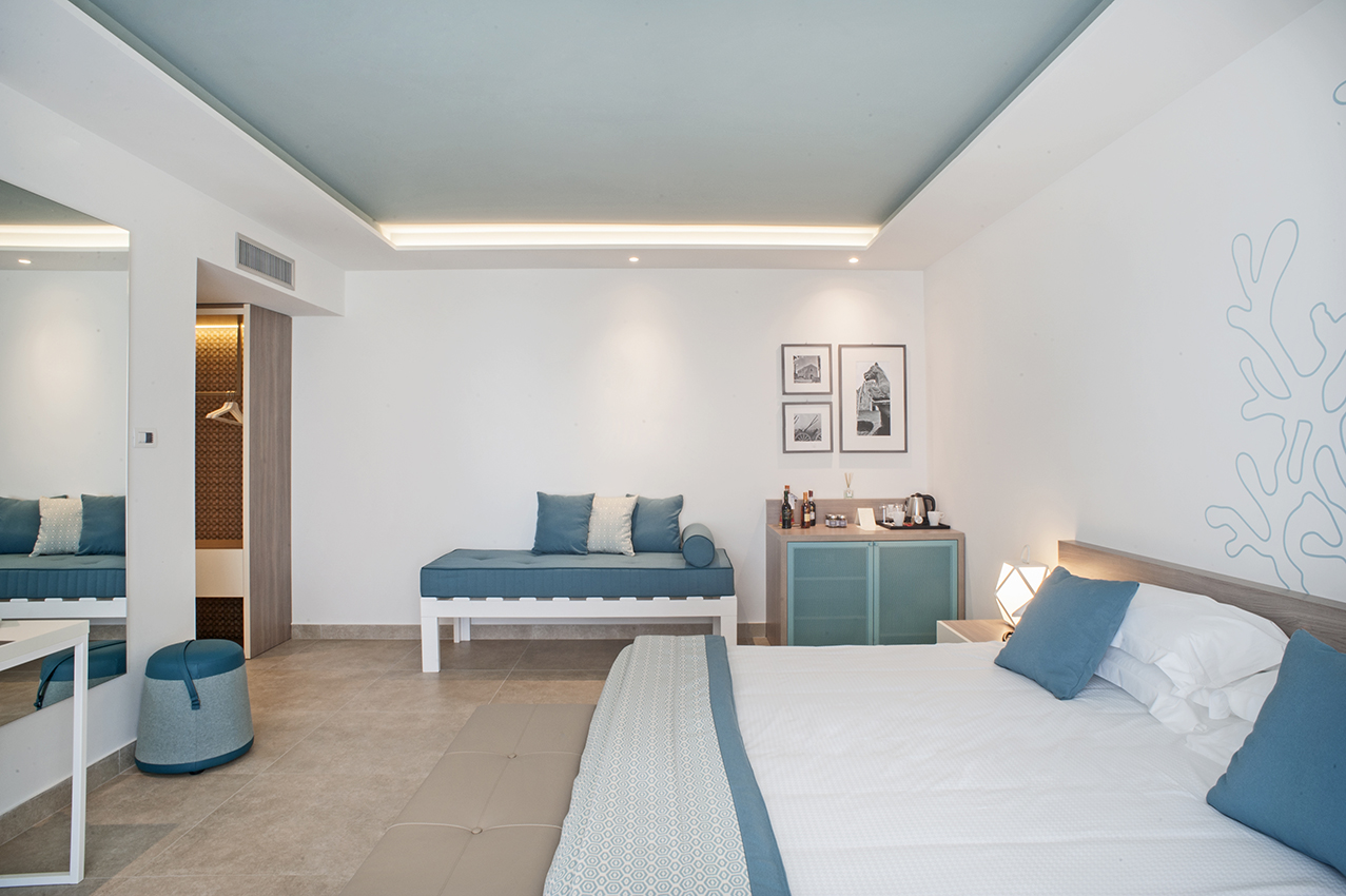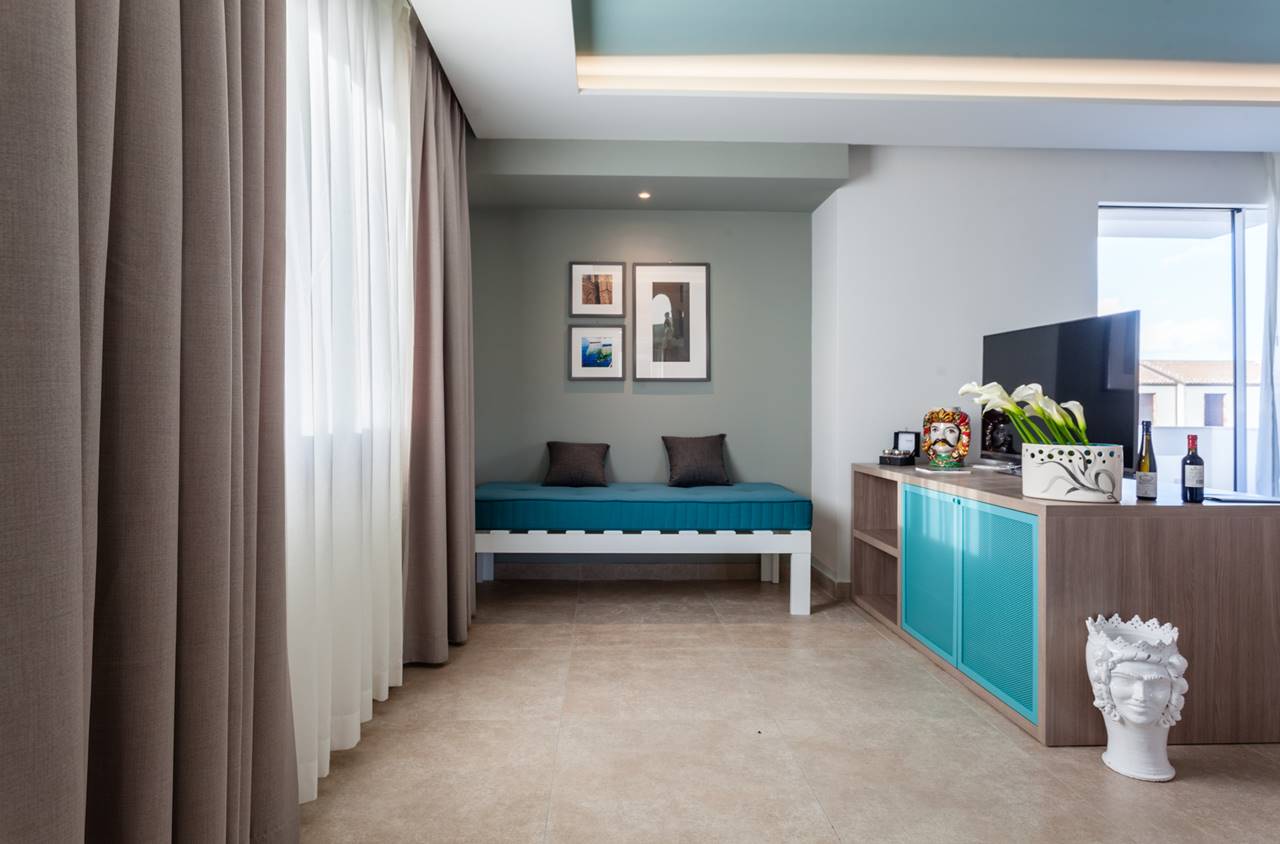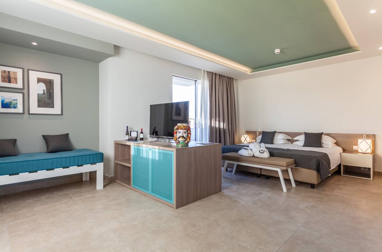 Le camere Deluxe sono ambienti eleganti dal design mediterraneo, di circa 25 mq. Posizionate dal primo al terzo piano, possono regalarti una suggestiva vista mare e hanno tutte un ampio balcone esterno. Le camere dispongono di letti separati o letto matrimoniale. Nella combinazione tripla e quadrupla, sono dotate di divano letto o letti a castello.