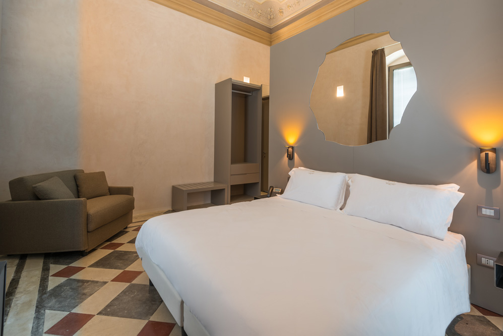 Suite: Il lusso di uno spazio esclusivo per il tuo relax. La soluzione perfetta per una fuga romantica, in una villa piena di fascino in cui antico e moderno dialogano in armonia: il letto matrimoniale a due piazze e mezzo e la vasca Jacuzzi in cui è possibile rilassarsi guardando il cielo rendono la suite il luogo perfetto per vivere e celebrare momenti speciali. Ricavata nel piano nobile, in cui originariamente si trovano le stanze da letto della famiglia, l’ampia suite gode degli antichi soffitti affrescati e dell’affaccio sul giardino interno; accogliente e luminosa, è ideale per un soggiorno esclusivo tra relax e design, grazie agli arredi firmati Charles & Ray Eames. Oltre il letto King Size 200×200 e il divano letto, la suite dispone di materassi e cuscini Simmons, un bagno privato di circa 16 mq con box doccia e una speciale linea cortesia che mette insieme natura e benessere, in un percorso olfattivo che si compone di fragranze biologiche siciliane ideato da Ciuri. Telefono, asciugacapelli, cassaforte, Aria condizionata/riscaldamento, Mini Bar (bevande e alcolici), Wi-Fi con fibra, TV 32” UHD e Pay TV.