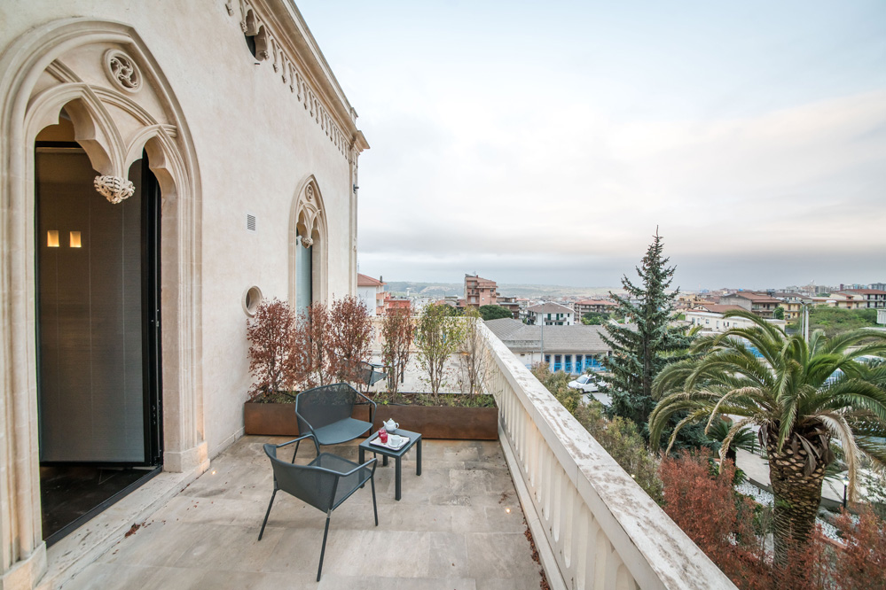 JUNIOR SUITE: Luce e spazio in una suite con balcone e loggia, per godere della vista del giardino della Villa in totale intimità, in un’atmosfera resa affascinante dall’architettura della dimora. All’interno della suite due ambienti separati - uno dedicato alla zona salotto e l’altro alla zona notte - per un soggiorno in totale relax: una soluzione ideale per chi viaggia per lavoro e per chi desidera godersi una vacanza tra storia e design, tra natura e soffitti affrescati. La Junior Suite Loggia dispone di materassi e cuscini Simmons, box doccia e un’esclusiva linea cortesia che richiama gli odori del giardino mediterraneo firmata da Ciuri, che si compone con fragranze biologiche siciliane. Su richiesta è possibile aggiungere la culla.